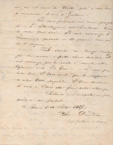 AUTOGRAFOAlcune considerazioni di Gualtieri inviate al librario torinese su “La capanna dello Zio Tom”, il romanzo della scrittrice statunitense Harriet Beecher Stowe pubblicato nel 1852 (il cui titolo originale è “Uncle Tom's Cabin or Life Among the Lowly”): «Ciò che maggiormente chiama l’attenzione del mondo attuale è la questione indiana. E molto accorto sarebbe quell’editore che pubblicasse un romanzo popolare del genere della Capanna dello Zio Tom nel quale si descrissero le tirannie degli Inglesi, la schiavitù degli Indiani, gli apparecchi della rivolta ed i principi della insurrezione […]».