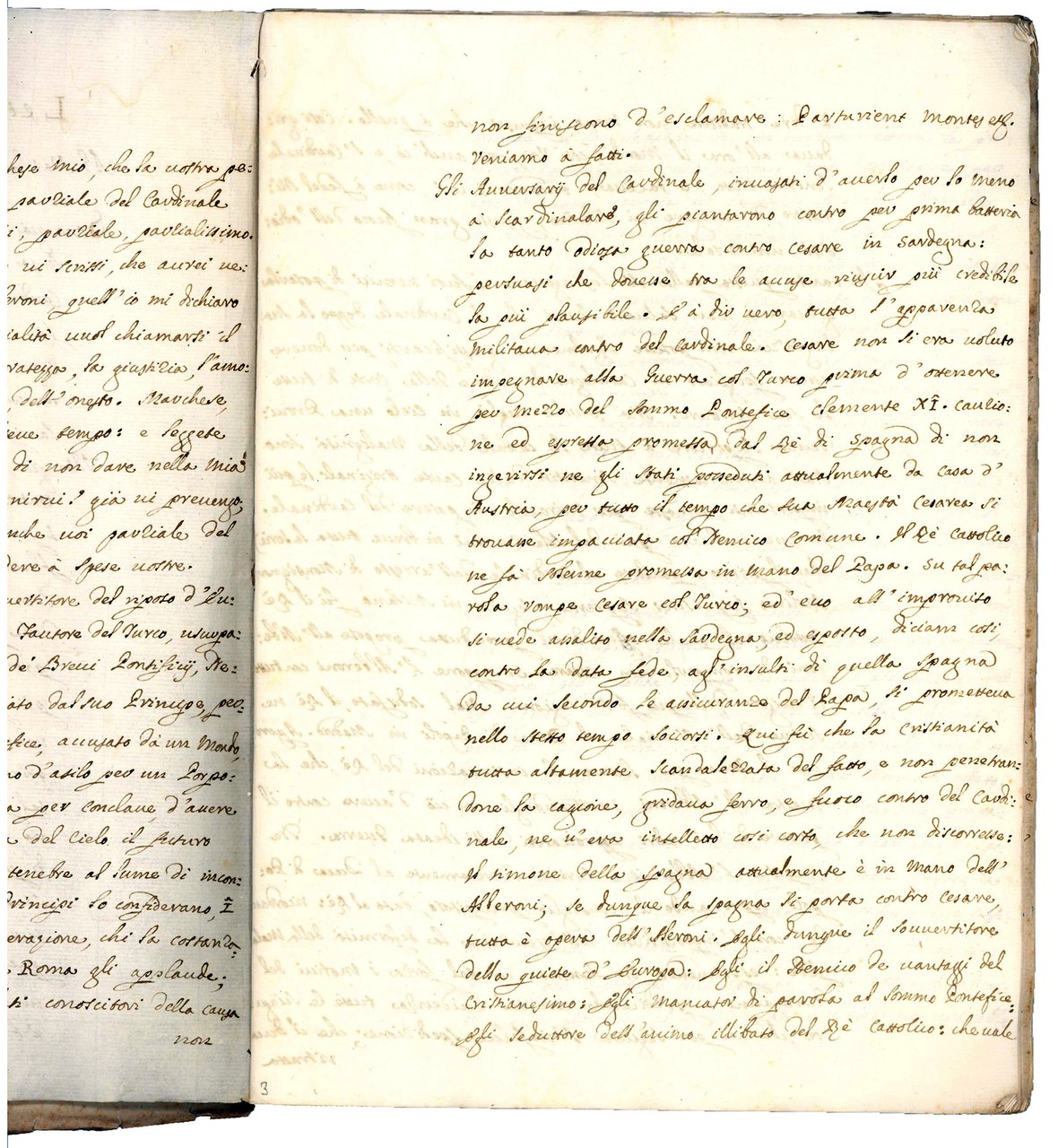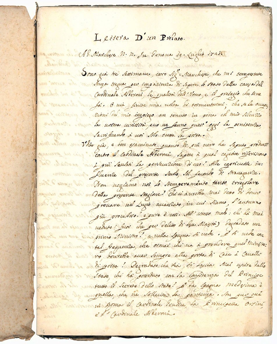 Copia manoscritta (un'edizione a stampa, oggi molto rara, apparve senza note tipografiche intorno al 1721) di questo testo riguardante la causa del cardinal Giulio Alberoni. L'anonimo autore si avvale, per alleggerire un poco la densa relazione, dell'espediente letterario del dialogo epistolare, quanto mai fittizio, dove lo scrivente previene le domande dell'impaziente Marchese che da tre settimane lo tempesta per sapere a che punto è la causa del cardinale.