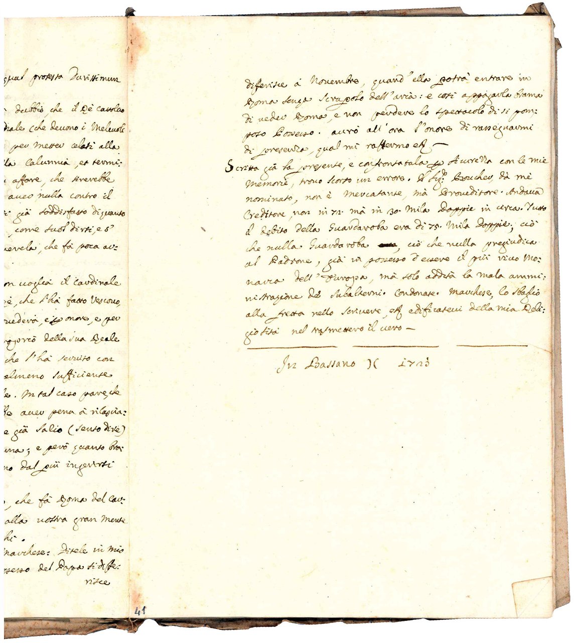 Lettera d'un Prelato al Marchese N.N. in Genova 19 Luglio 1721 (explicit: In Bassano 1721). Manoscritto cartaceo in italiano. Italia, prima metà del XVIII secolo