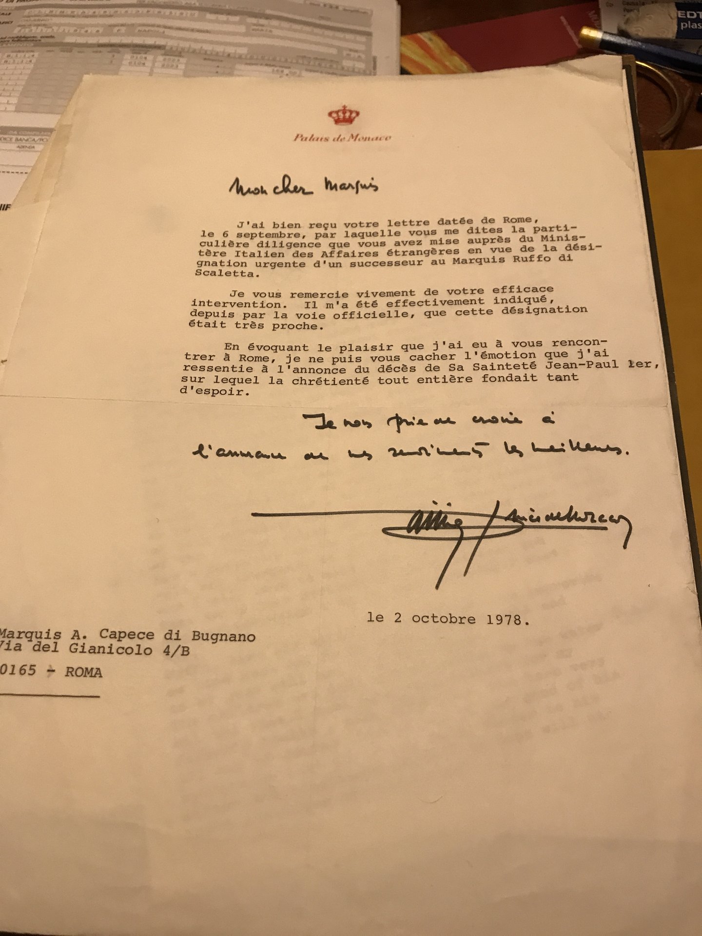 Lettera dattiloscritta su carta intestata "Palais de Monaco", formato cm. 29,0x21,0. datata 2 ottobre 1978, Due righe manoscritte in fine e firma autografa del Principe Ranieri di Monaco.