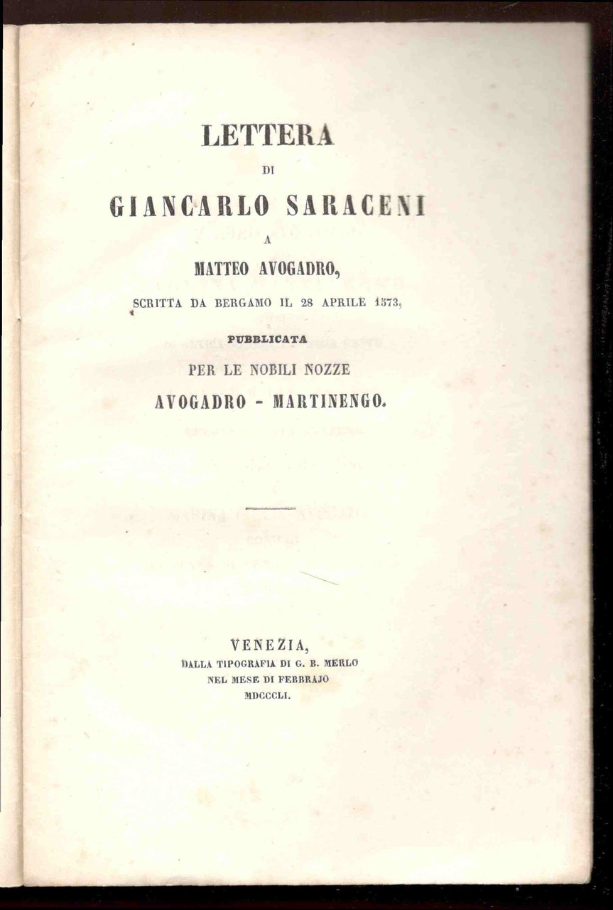 Lettera di Giancarlo Saraceni a Matteo Avogadro, scritta da Bergamo il 28 aprile 1573. Pubblicata per le nobili nozze Avogadro-Martinengo