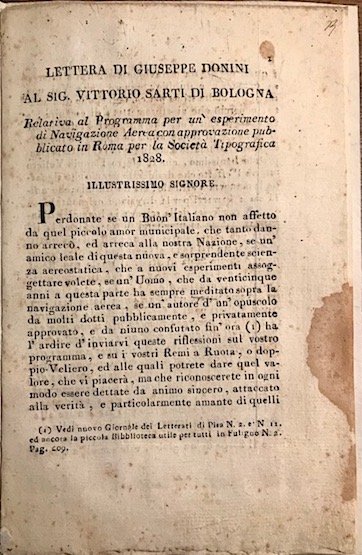 Lettera di Giuseppe Donini al Sig. Vittorio Sarti di Bologna relativa al Programma per un esperimento di Navigazione Aerea con approvazione pubblicato in Roma per la Società Tipografica 1828