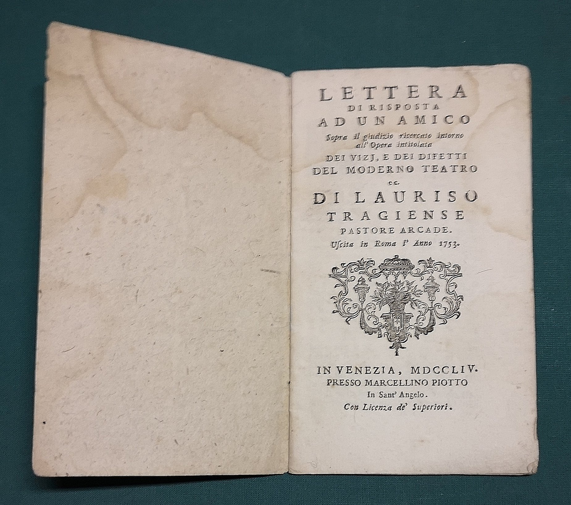 >in-12, pp. 24, leg. orig. in cartoncino rustico. Vignetta al front., iniziale silogr. Prima edizione dell'anonima lettera di risposta alla conciliante opera di Antonio Bianchi (detto il Laurisio, vedi scheda precedente) sul teatro. L'autore della lettera, che in fine si firma N.N., sembra invece sostenere la posizione più radicale del teologo Concina, che aveva affermato che il teatro era fonte di ogni corruzione. Raro. Buon esemplare (lieviss. alone d'umido). Lancetti, 158
