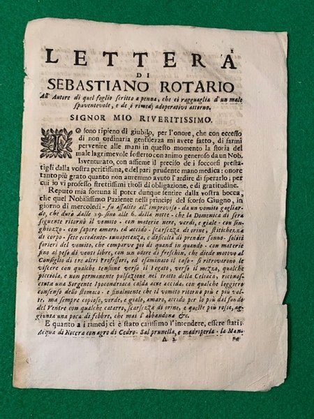 In 4°; 4 pp. Senza brossura. Prima ed unica rara edizione di questo scritto polemico del noto medico veronese, Sebastiano Rotari (1667-1742) celebre per i suoi scritti polemici contro l'utilizzo del salasso per la cura dei malati e fautori dell'introduzione del mercurio per la cura di numerosissime malattie. In questo scritto il medico veronese descrive il caso di un nobiluomo colpito da vomito ininterrotto per più di 10 ore curato con diversi preparati farmaceutici come l'acqua di cedro, il latte di vacca, il Nitro, la tintura di rabarbaro ecc. ecc. Esemplare in buone condizioni di conservazione.