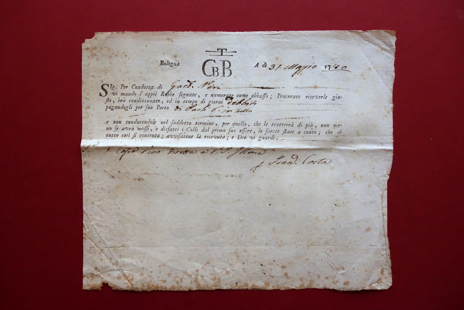 Antica ettera di vettura, Antica lettera di vettura a stampa sezioni bianche compilate manualmente per consegna di 1 cassa di vino datata Bologna, 31 maggio 1780 1780; antica lettera di vettura a stampa su carta; sezioni bianche compilate manualmente (compilazione d'epoca a mano); cm 19x22. Condizioni di conservazione Buone condizioni con usuali tracce d'uso e del tempo; normali tracce di pieghe per conservazione; alcune piccole bruniture; margini con irregolarità. Per maggiori dettagli vedi foto. SC03.D19434 N