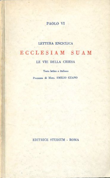 146 p. ; 20 x 12 cm. La cattedra. Il 6 agosto del 1964, Paolo VI si rivolgeva alla Chiesa e al mondo con questa sua prima enciclica "Ecclesiam suam". Fu un documento che segnò uno stile nuovo non solo tra Chiesa e mondo, ma anche per il dialogo interconfessionale e interreligioso. Il Concilio Vaticano II stesso nelle grandi costituzioni come la "Lumen gentium" e la "Gaudium et spes", e nei decreti "Unitatis redintegratio", "Nostra aetate" e "Dignitatis humanae", deve molto allo spirito che soggiace a questa enciclica. . Brossura editoriale, coperta in cartoncino flessibile, titolo impresso in rosso al piatto e al dorso,. Codice libreria 3273.
