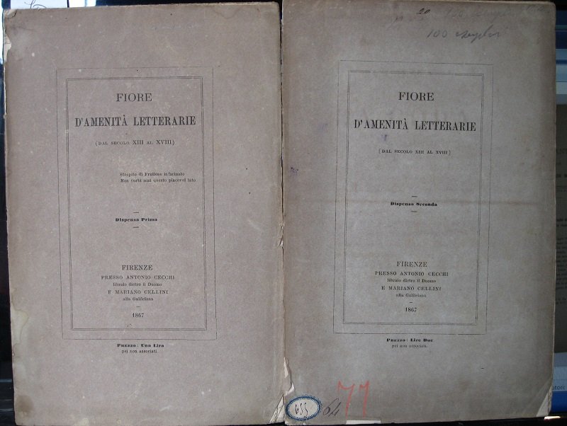 2 voll. in 8, pp. 15 + (1b); 29 + (1b). Lievi danni ai d. Br. ed. Edizione di 100 esemplari. I due testi, la Lettera familiare a Lorenzo Lippi, e la Cicalata sopra la coda.', curati entrambi da Giulio Piccini, si trovano all'interno della raccolta in due dispense dal titolo Fiore d'amenita' letterarie (dal secolo XIII al XVIII). La prima e' una lettera burlesca indirizzata al pittore Lorenzo Lippi; come la seconda, La cicalata sopra la coda, firmata con lo pseudonimo di Scapafico Codacci e dedicata 'alla signora N.N. nell'occasione d'aver dato alla luce un figlio maschio', intessuta di giochi di parole e allusioni oscene.
