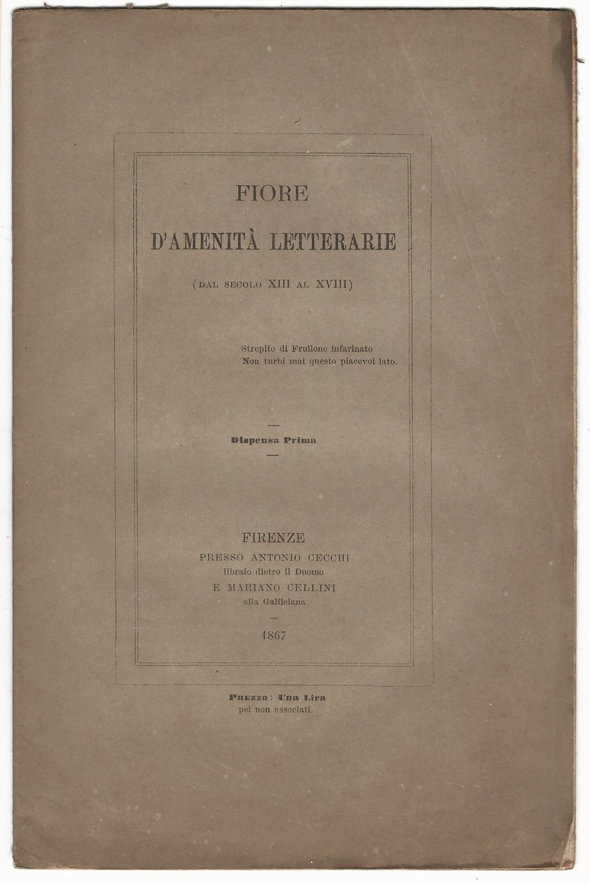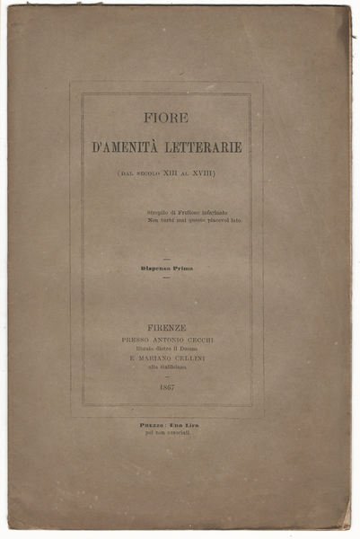 In 8, p. 15 [1], br. orig. - Ediz. di 100 esemplari. Dispensa prima della raccolta "Fiore d'amenità letterarie".