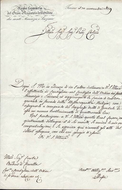 Bifolio manoscritto sulla prima facciata, con firma autografa di Mussa e altre firme, e intestazione litografica della “Regia Segreteria del Gran Magistero dell'Ordine dei santi Maurizio e Lazzaro”, datata “Torino il 30 novembre 1829”. Lettera scritta per undici righe più la firma, con la quale si comunica al Conte ANDREIS DI CIMELLA che gli sarà versato un compenso in denaro. Giuseppe Francesco MUSSA fu Cavaliere di Gran Croce dell'Orine dei SS. Maurizio e Lazzaro, e Primo Segretario di S. M. il Re pel Gran Magistero (dal 1823 al 1832).
