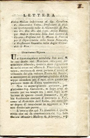 Lettera Fisico - Medica indirizzata al Sig. Cavaliere D. Alessandro Volta, Professore di Fisica Sperimentale nella R. Università di Pavia - Aggiunte, e Responsiva sull'Ignivomo, diretta al Sig. Cav. Alessandro Volta - Lettera responsiva.