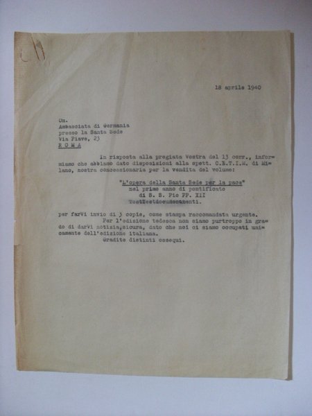 Lettera / invio all´Ambasciata di Germania presso Santa Sede ROMA. Volume "Opera della Santa Sede per la Pace" 1940