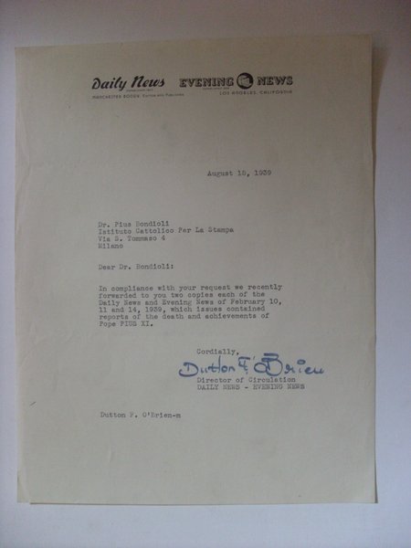 Risposta all´Istituto Cattolico per la Stampa MILANO - Pius Bondioli per articolo morte Papa Pio XI.