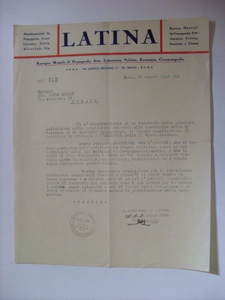 Lettera LATINA Rassegna Mensile di Propaganda,Arte,Letteratura,Politica,Economia,Cinematografia ROMA 1942