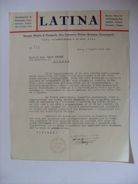Lettera LATINA Rassegna Mensile di Propaganda,Arte,Letteratura,Politica,Economia,Cinematografia ROMA 1942