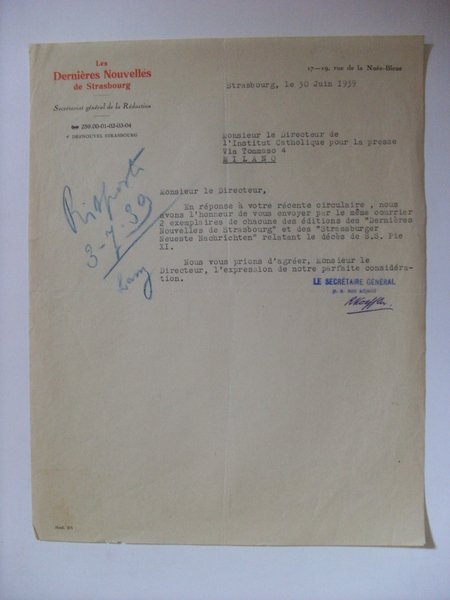 Lettera Les Dernières Nouvelles de Strasbourg 1939