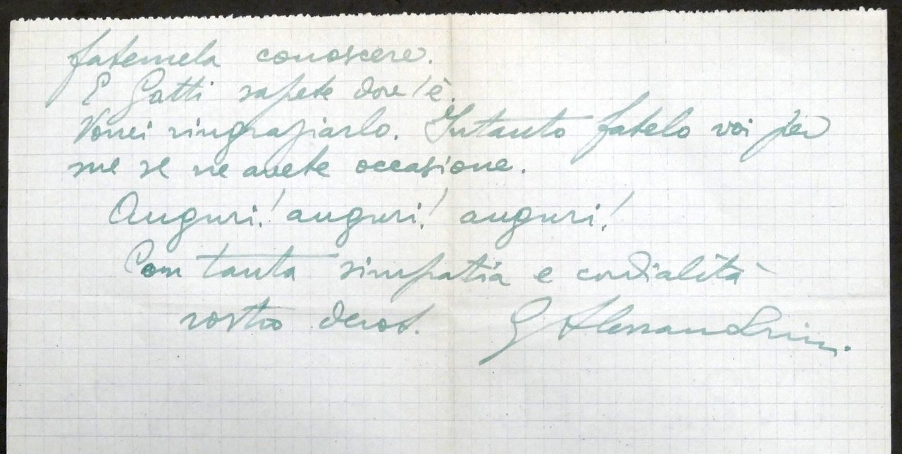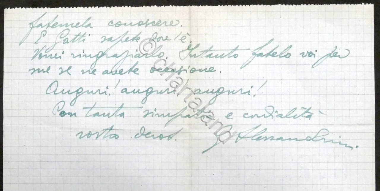 Un foglio, due facciate manoscritte con firma del poeta toscano Gariboldo Alessandrini - 1946 Lingua italiana.Condizioni generali molto buone. Garibaldo Alessandrini (nato a Ripa di Seravezza nel 1886, morto a a Pietrasanta nel 1964) è stato un poeta e dicitore italiano.