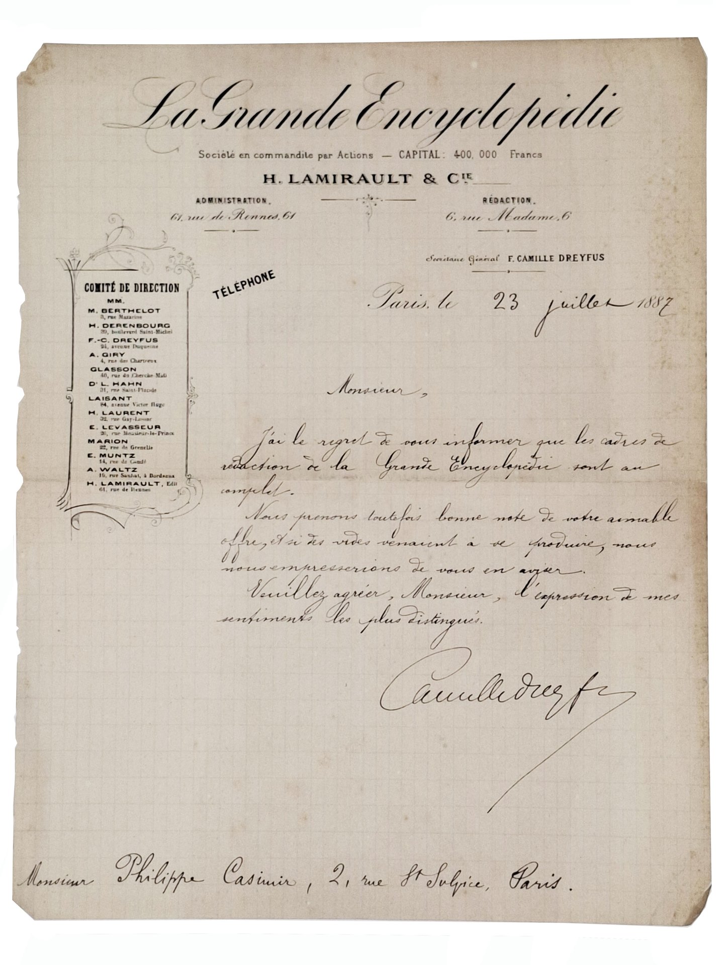 Lettera manoscritta, datata 'Paris, le 23 juillet 1887', su carta intestata de 'La Grande Encyclopedie / H. Lamirault & Cie', con autografo originale, a penna, del segretario generale della Società: Ferdinand Camille Dreyfus (1851 - 1905), giornalista e politico. Testo della lettera in lingua francese. La lettera consta di un foglio compilato su una sola facciata. La lettera, destinata al direttore di un giornale francese, è stata, presumibilmente, spedita in quanto è presente una linea di piegatura centrale. Sono presenti piccoli taglietti e piccole pieghette marginali ma, nel complesso, un buon esemplare. Formato della lettera: 21,5 x 27 cm circa.