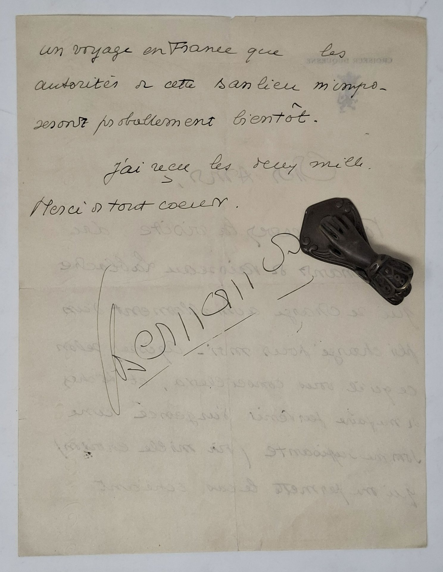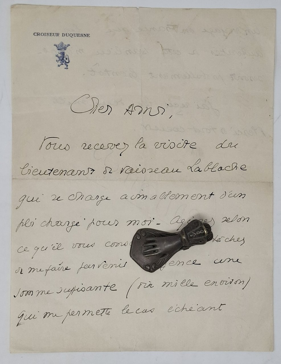 Lettera manoscritta di 2 pagine, entrambe scritte, non datata, con autografo originale, a penna, del celebre scrittore francese Georges Bernanos (1888 - 1948) che si firma 'Bernanos'. Testo della lettera in lingua francese. La lettera è stata, presumibilmente, spedita in quanto sono presenti lineee di piegatura. La lettera è su carta intestata della 'Croiseur Duquesne' (incrociatore costruito per la marina francese). Stato di conservazione: minuscoli taglietti sui margini del foglio ma, nel complesso, abbastanza ben conservata. Formato della lettera: 21 x 27,5 cm circa.