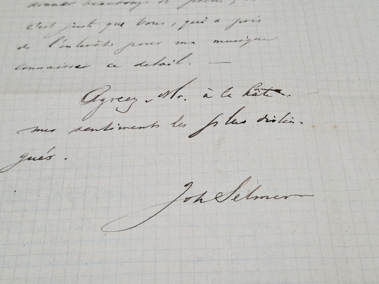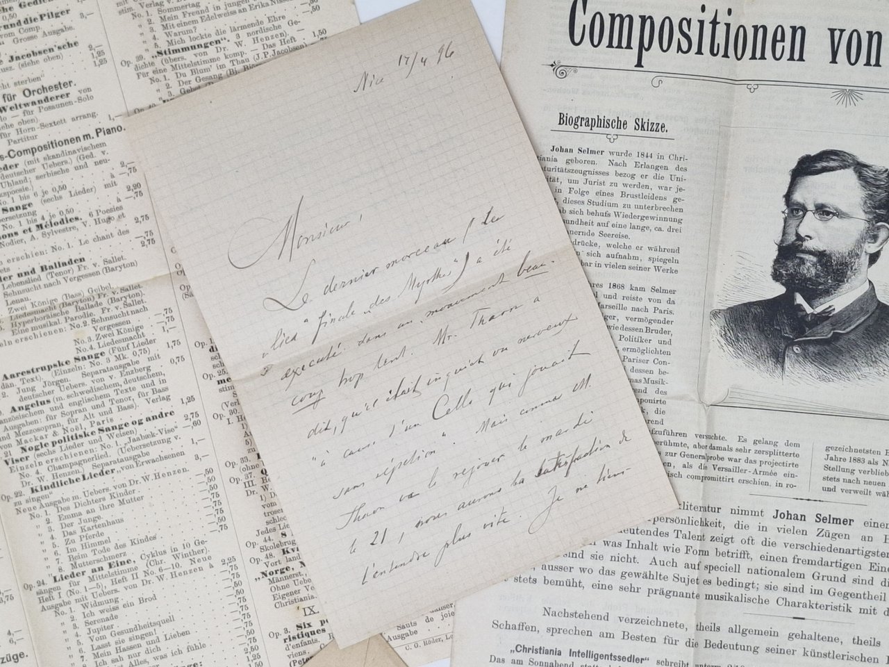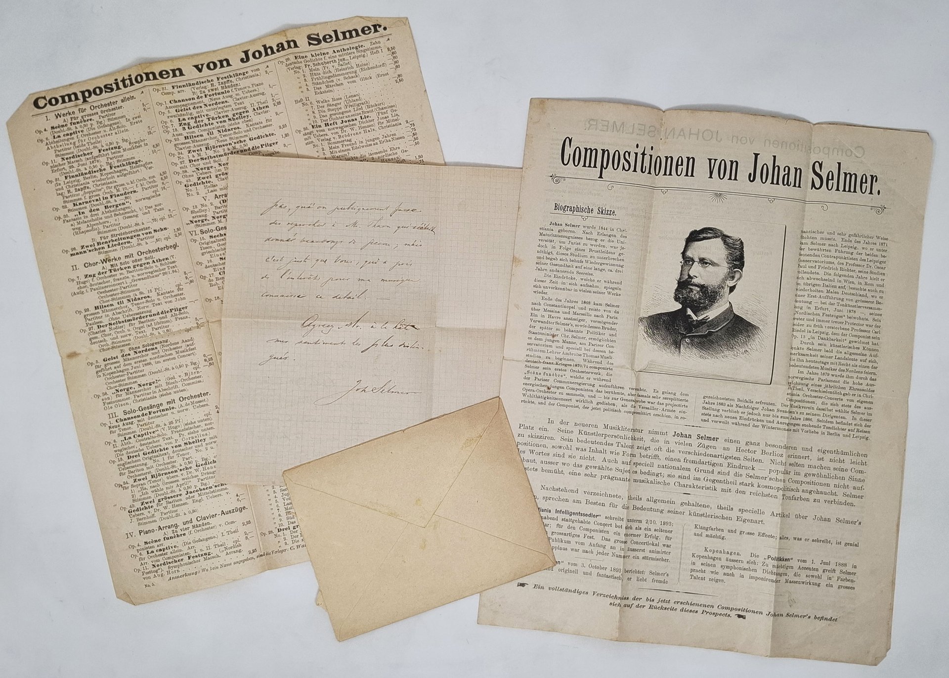 Lettera manoscritta, datata 'Nice 17/4 96', su carta a quadretti, con autografo originale, a penna, di Johan Selmer (Christiania 1814- Venezia 1910) , compositore norvegese. La lettera fu inviata in busta (conservata) al direttore di un quotidiano francese. Testo della lettera in lingua francese. La lettera presenta quattro facciate, di cui solo le prime due con testo. Stato di conservazione: il foglio (inviato in busta) è stato piegato in due parti e conserva, pertanto,la linea di piegatura ma, nel complesso, un esemplare decisamente ben conservato. Joah Selmer fu un personaggio interessante anche dal punto di vista storico e politico in quanto partecipò attivamente alla alla Comune di Parigi (1871) e, a causa di ciò, sfuggì per un pelo a una condanna a morte. Oltre alla lettera manoscritta e alla busta che la conteneva, il lotto comprende: 1) un foglio stampato da C. G. Roder che elenca, in lingua tedesca, le numerose composizioni di Selmer; 2) un depliant di 4 pagine che, oltre al ritratto del compositore e a riportare l'elenco delle composizioni, dà (in lingua tedesca) notizie relative alla biografia e all'attività del compositore (documento del 1894).I due documenti aggiuntivi sono stati più volte ripiegati su se stessi ma sono abbastanza ben conservati.