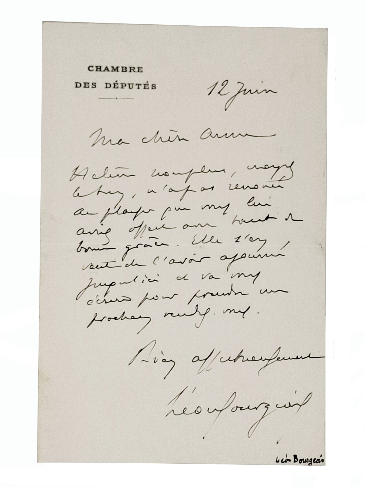 Lettera manoscritta, datata '12 Juin', su carta intestata della 'chambre des députés', con autografo originale, a penna, di Léon Bourgeois (1851-1925), personaggio politico francese, esponente del partito radical socialista, presidente del consiglio dei ministri della Francia (1895-1896), più volte ministro, presidente della camera dei deputati (1902-1904), presidente del senato. Per la sua opera nella società delle Nazioni, gli fu conferito nel 1920 il Premio Nobel per la Pace. Rivestì anche un ruolo presso la massoneria. Testo della lettera in lingua francese. Decisamente ben conservata (si segnala esclusivamente una piega centrale (presumibilmente la lettera fu inviata in busta). Formato della lettera: 11,5 x 17,5 cm circa. Si segnala l'indicazione del nome 'Leon Bourgeois' scritta a penna nera sul bordo inferiore del foglio per mettere in chiaro l'autografo da parte di un precedente collezionista.