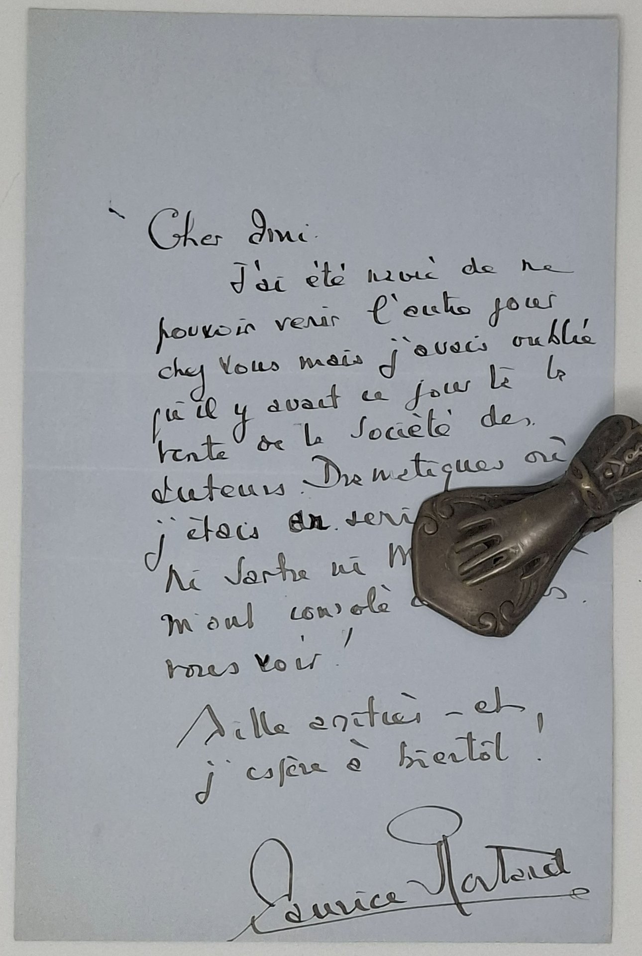 Lettera manoscritta su una facciata di un foglio filigranato, non datata, con autografo originale, a penna, dello scrittore francese Maurice Rostand (1891 - 1968), figlio del poeta e scrittore Edmond Rostand (autore, tra le altre cose, del celebre 'Cyrano de Bergerac') e della poetessa Rosemonde Gerard. Fu uno scrittore noto anche per il suo ecclettismo. Testo della lettera in lingua francese. ben conservato. Formato del foglio: 13,5 x 21 cm circa.