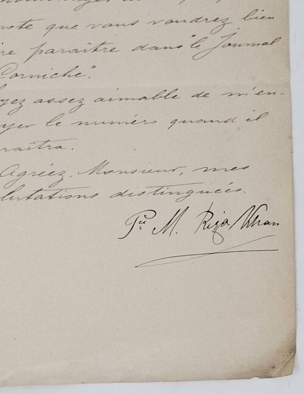 lettera manoscritta con autografo originale di Mirza Riza Khan