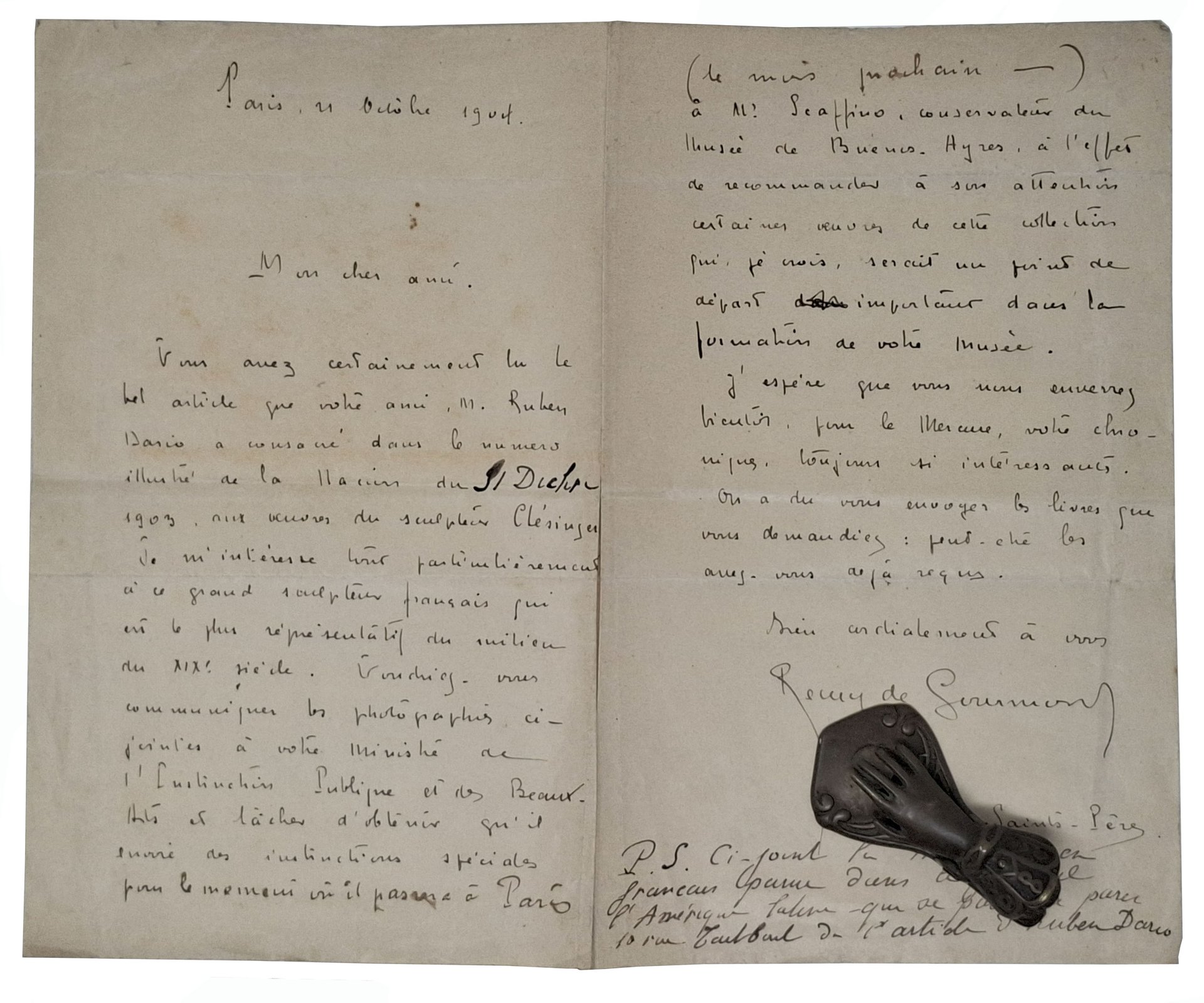 Lettera manoscritta di 4 pagine, delle quali due sole scritte, datata 'Paris, 21 octobre 1904', con autografo originale, a penna, del poeta, romanziere e giornalista, nonché scrittore e critico d'arte francese Remy De Gourmont (1858 - 1915). Testo della lettera in lingua francese. La lettera è stata, presumibilmente, spedita in quanto sono presenti linee di piegatura. Sono presenti leggere stropicciature marginali ma, nel complesso, un buon esemplare. Formato della lettera chiusa: 14 x 22,5 cm circa.