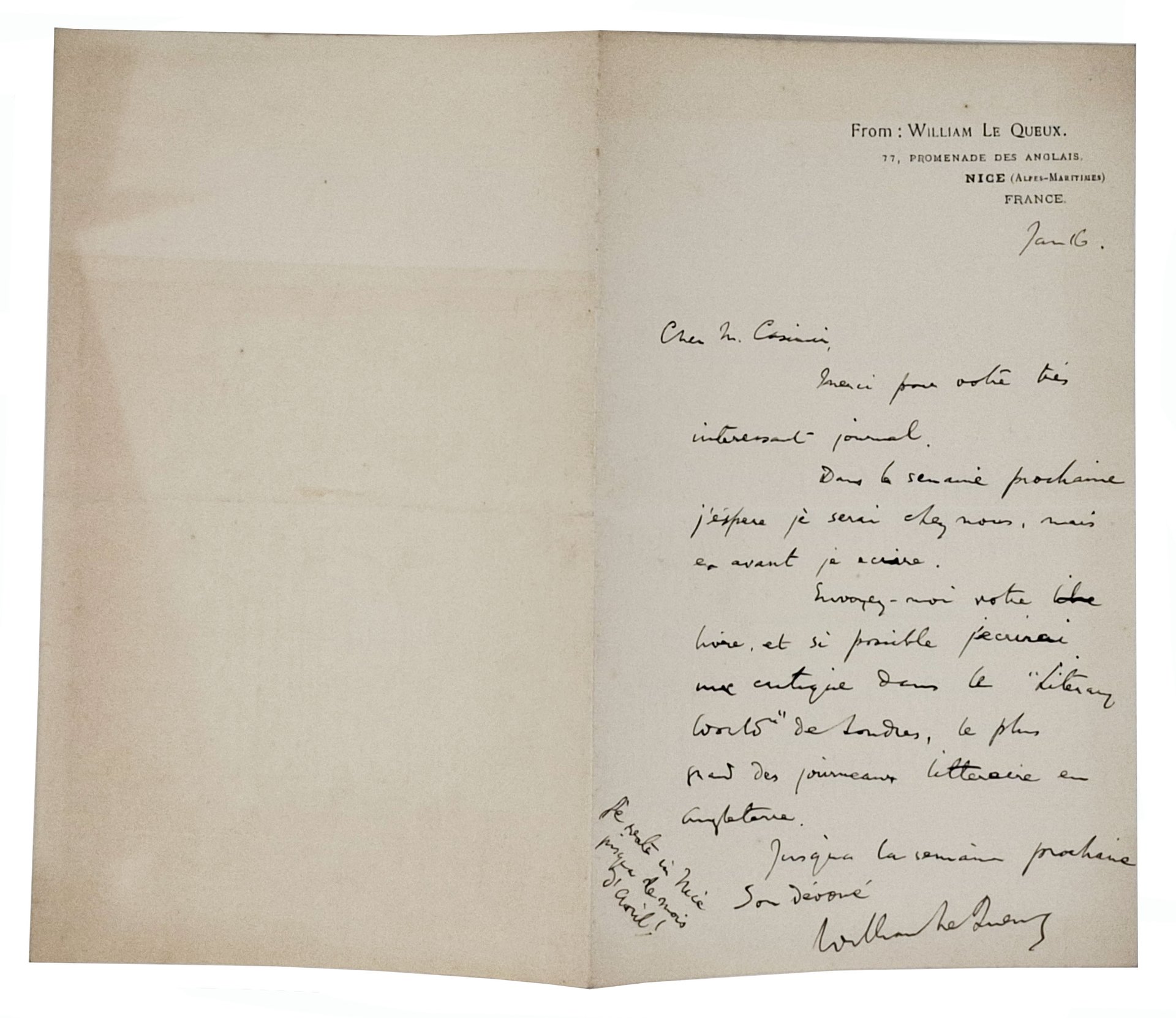 Lettera manoscritta, datata solo 'Jan 16', su carta intestata, con autografo originale, a penna, di William Le Queux (1864 - 1927), giornalista e scrittore anglo-francese (autore di 150 romanzi), nonchè diplomatico e appassionato di volo.Testo della lettera in lingua francese. La lettera consta di 4 pagine di cui solo la prima facciata scritta. La lettera è stata, presumibilmente, spedita in quanto è presente una linea di piegatura centrale, ma, nel complesso, un ottimo esemplare. Formato della lettera: 11 x 18 cm circa.