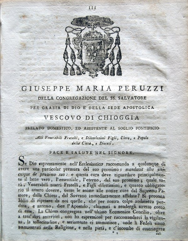 In-8° (22,7 x 17,6 cm), pagine XX, copertina muta moderna. Stemma del vescovo a pagina III. Esemplare ben conservato. Si tratta della lettera pastorale indirizzata da Giuseppe Maria Peruzzi, vescovo di Chioggia, al clero e al popolo della città e della diocesi, circa la dottrina cristiana. Le pagine VIII-XX ospitano un regolamento dettagliato relativo all'insegnamento della dottrina cristiana nelle parrocchie. Indice: Giuseppe Maria Peruzzi della Congregazione del SS. Salvatore per grazia di Dio e della Sede Apostolica Vescovo di Chioggia Prelato Domestico, ed Assistente al Soglio Pontificio, Alli Venerabili Fratelli, e Dilettissimi Figli, Clero, e Popolo della Città, e Diocesi, pace e saluto nel Signore; Regolamento della Dottrina Cristiana per la città, e diocesi di Chioggia. I. Disposizioni Generali; II. Ispezioni delle cariche. Visitatore Generale, e Vicarj Foranei. Direttori, e Vice-Direttori. Protettori e Vice-Protettori. Cancellieri e Vice-Cancellieri. Maestri e Supplenti. Regolatori e Vice-Regolatori. Portinari, e Silenzieri. Cantori. Bidelli; III. Metodo d'insegnare. Nella Prima Classe. Parte I. Lezione 17. Compendio di tutto il Simbolo; Lezione 18. Della professione del Cristianesimo; Lezione 8. Di Gesù Cristo; Lezione 9. Del Mistero dell'Incarnazione. Parte II. Lezione 3. Del primo Comandamento; Lezione 4. Del secondo e del terzo Comandamento; Lezione 5. Del quarto comandamento; Lezione 6. Continuaz. del quarto Comandamento; Lezione 7. Contin. del medesimo Comandamento; Lezione 8. Del quinto, sesto e nono Comandamento; Lezione 9. Del settimo ed ottavo Comandamento; Lezione 10. Del decimo Comandamento; Lezione 12. Del primo Comandamento della Chiesa; Lezione 13. De cinque ultimi Comandamenti della Chiesa. Nella Seconda Classe. Parte III. Lezione I. Della Preghiera; Lezione 2. Delle disposizioni necessarie per ben pregare; Lezione 3. Dell'Orazione Dominicale; Lezione 4. Della Salutazione Angelica e Invocazione de Santi. Parte I. Lezione 13. Della Grazia; Lezione 15. Della Comunione de Santi. Parte II. Lezione 17. De peccati d'Omissione. Parte III. Lezione 22. Delle Indulgenze; Lezione 5. De Sacramenti in generale. Nella Terza Classe. Parte III. Lezione 15. Del Sacramento della Penitenza; Lezione 16. Della Contrizione in generale; Lezione 17. Della Contrizione perfetta, e dell'Attrizione; Lezione 18. Della Confessione; Lezione 19. Dell'Esame di Coscienza ec.; Lezione 20. Della maniera di Confessarsi; Lezione 21. Della Soddisfazione; Lezione 8. Del Sacramento dell'Eucaristia; Lezione 9. Del Santo Sacrificio della Messa; Lezione 10. Continuazione del S. Sacrificio della Messa; Lezione 12. Delle disposizioni necessarie ec.; Lezione 13. Di ciò che bisogna fare quando si è vicino a comunicarsi ec.; Lezione 14. Di ciò che si dee fare dopo la Comunione. IV. Orazioni in comune. La Prima Domenica del Mese. Canzone spirituale per la processione, che si fa prima di cominciar la Dottrina, a distruzione delle Bestemmie e canti disonesti. V. Processioni, premj, dispute, vacanze, questue, castighi. VI. Formula. Da usarsi nel contrassegnare il passaggio da una in altra Classe dei Fanciulli. Prima Classe. Avvertimenti. Seconda Classe. Avvertimenti. Terza Classe. Avvertimenti. Quarta Classe. Avvertimenti. Quinta Classe. Avvertimenti. VII. Appendice. Per la dottrina delle donne.
