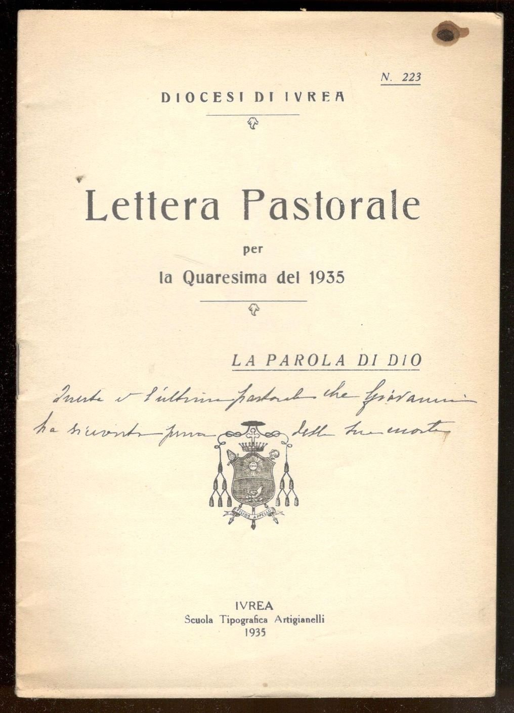 Fascicolo in 8°, pp. 22. Brossura editoriale con lo stemma dei Matteo Angelo Filipello, vescovo di Ivrea. Copia in buono stato.