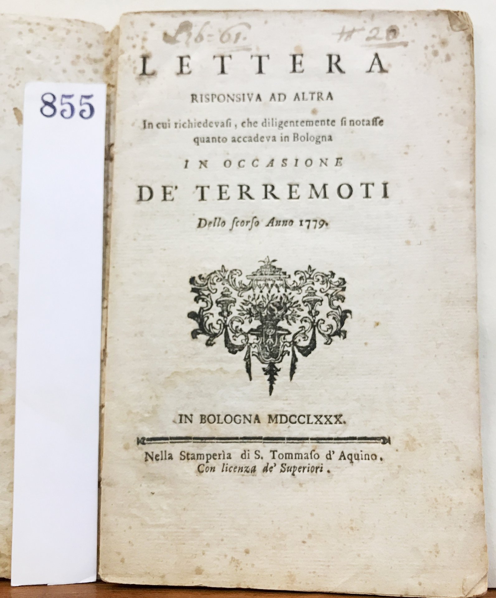 LETTERA RISPONSIVA AD ALTRA IN CUI RICHIEDEVASI, CHE DILIGENTEMENTE SI NOTASSE QUANTO ACCADEVA IN BOLOGNA IN OCCASIONE DE' TERREMOTI DELLO SCORSO ANNO 1779.