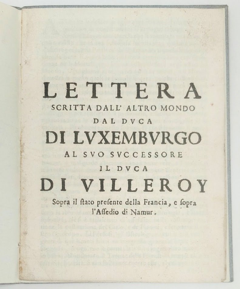 Lettera scritta dall'altro mondo dal Duca di Luxemburgo al suo successore il Duca di Villeroy. Sopra il stato presente della Francia, e sopra l'Assedio di Namur.