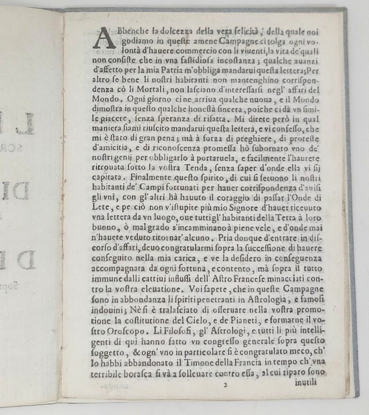 >placchetta in-4, pp. 8 (titolo e 6 di testo), cartonato muto del '900. Testo di anonimo autore, scritto come una lettera indirizzata dal defunto Francesco Enrico di Montmorency-Luxembourg a François de Neufville de Villeroy, durante la Guerra della Grande Alleanza. Alla morte di Montmorency-Luxembourg, Villeroi divenne comandante in capo dell'esercito delle Fiandre e ne fu dunque il successore. Nonostante il riferimento all'assedio di Namur (1692), il tono della lettera, "scritta dall'aldilà" e piena di riferimenti a conversazioni del Duca di Lussemburgo con altri dotti defunti, lascia pensare che il testo sia stato scritto sul finire della guerra tra Guglielmo III e Luigi XIV, poiché grazie alla preveggenza ultraterrena ammonisce il lettore sull'imminente caducità della Francia. Appare quindi evidente che l'autore, benché lodi il Villeroy sappia bene che sarà un comandante mediocre rispetto al suo predecessore e sarà incolpato del bombardamento di Bruxelles, e probabilmente sappia anche quale sarà l'esito della guerra, in cui la Francia perderà pressocché tutte le terre conquistate. Rarissima curiosità storica di fine XVII° secolo. Ottimo esemplare.