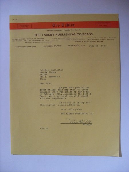 Lettera THE TABLET Publishing Company - A Catholic Newspaper. Brooklyn 1939