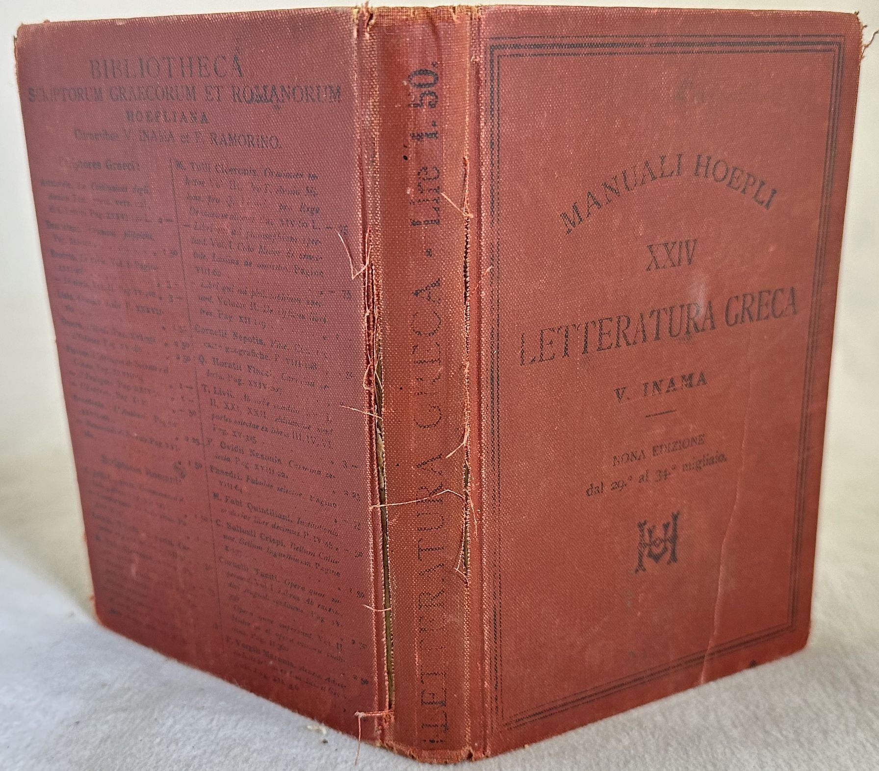 Edizione del 1893 di questo manuale Hoepli di letteratura greca scritto da Vigilio Inama. Tra gli argomenti trattati: Poesia religiosa, epica, lirica, poesia drammatica, prosa, le lettere greche dopo Alessandro ecc. Tabella ripiegata: Prospetto della storia della letteratura greca. Note manoscritte al contropiatto anteriore. In mediocri condizioni. Copertina in tela editoriale in discrete condizioni generali con usure ai margini e dorso. Legatura in mediocri condizioi con rotture e copertina staccata dal corpo del libro. Pagine in buone condizioni con fioriture. In 16. cm 15,5x10,5. Pp. VII+231+30. Edition of 1893 of this hoepli manual of greek litterature written by Vigilio Inama. Folded chart: Prospect fo history of greek litterature. Drawing in the front counterplate. Handwritten text in the first blank page. In fair condition Cloth editorial cover in fair conditions with wearings in the edges and spine. Binding in poor conditions with cracks and cover detached from the body of the book. Pages in good conditions with foxing. In 16. cm 15,5x10,5. Pp. VII+231+30.