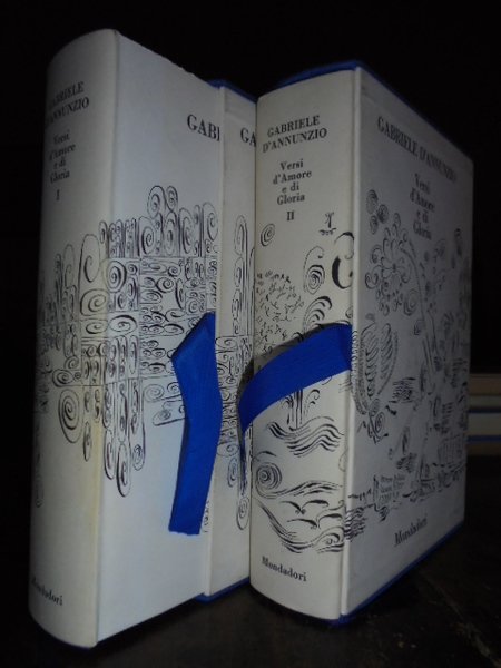 (Letteratura-Poesia) D' ANNUNZIO, Gabriele. Milano, Mondadori, 1950. Versi d' Amore e di Gloria. 1. Primo vere - Canto novo - Intermezzo - Elegie romane - L' Isotteo - La Chimera - Poema paradisiaco - Odi navali - Appendici. 2. Laudi del cielo - Del mare - Della Terra e degli eroi. A cura di Lorenzo Bianchetti. 2 volumi in-8°, tela edit. con sovracopertina orig. e custodia in cart. telato. (8), 1152 pp. con ritratto ed un facsimile di lettera autografa f.t.; xxxx, 1162 pp. Bella edizione in carta india. Esemplare come nuovo. Uff. stanz. TV. mob. sinistra.