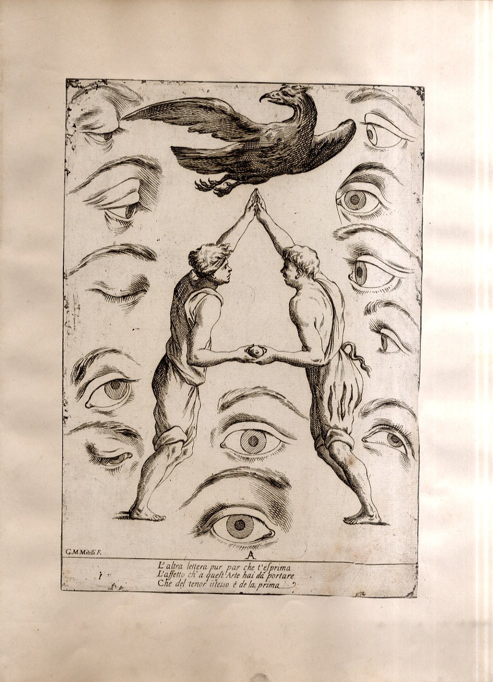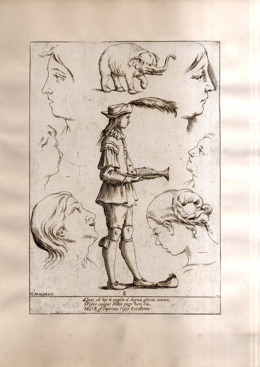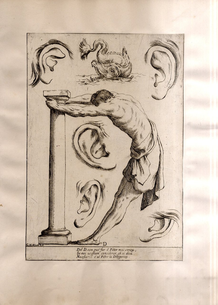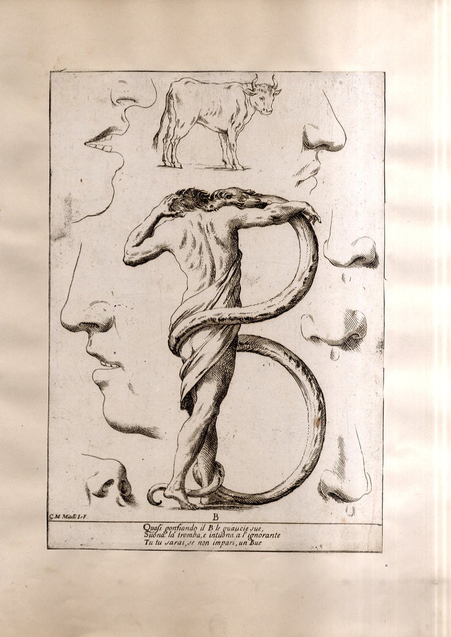 >Incisione all'acquaforte, foglio cm 27x19 applicato su carta antica. Tratta da '' Alfabeto in sogno''. Esemplare per disegnare di Giuseppe Maria Mitelli pittore Bolognese. L'incisore e pittore bolognese Giuseppe Maria Mitelli pubblicò nel 1683 l'“Alfabeto in sogno”, un manuale di disegno in cui le lettere della lingua italiana prendono la forma di corpi umani, congiunti fra loro o con altri esseri viventi e oggetti. Mitelli, nell'introduzione dell'opera, racconta di essere stato visitato in sogno da Morfeo. Il mitologico ministro delle apparizioni oniriche circondò l'artista con forme e visioni pertinenti alla nobilissima arte del Disegno “nostro unico diletto, e mio singolar esercizio: egli mi rappresentò le lettere dell'Alfabeto formate da incomposti fantasmi e da confuse immagini, e mi comandò che dovessi disegnare in proporzionate figure quegli embrioni, che, appena nati, svaniscono.Onde, io di subito svegliato, qui li ho disposti con simmetria, e alla vostra diligente applicazione dedicati”.