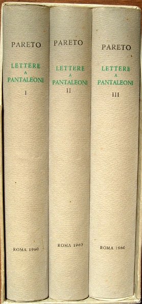 Tre volumi in-8° (cm 26,3x19), pp. XXIV, 504, (4); 468, (4); 580, (4), legatura in tela editoriale con sovraccoperta e cofanetto editoriale. Il colophon recita: "Di questa opera sono stati stampati tremila esemplari che costituiscono l'edizione originale fuori commercio". Indice: Volume primo 1890-1896: Prefazione; Anni 1890-1891. Nota introduttiva; Lettere 1-42; Nota finale: L'articolo di V. Pareto sulla "Revue des Deux Mondes". Anno 1892. Nota introduttiva; Lettere 43-133. Anni 1893-1894. Nota introduttiva; Lettere 134-188; Anni 1895-1896. Nota introduttiva; Lettere 189-247. Volume secondo 1897-1906. Anno 1897. Nota introduttiva; Lettere 248-321; Nota finale: Le polemiche intorno alla partenza di Pantaleoni per la Svizzera; Anno 1898. Nota introduttiva; Lettere 322-412; Nota finale: I fatti del maggio 1898 e gli operai italiani in Svizzera. Anno 1899. Nota introduttiva; Lettere 413-438. Anno 1900. Nota introduttiva; Lettere 439-475. Anno 1901. Nota introduttiva; Lettere 476-503; Nota finale: La polemica Croce-Pareto. Anno 1902. Nota introduttiva; Lettere 504-514; Note finali: I. La rottura tra il Pantaleoni e l'Estrema Sinistra; II. Lo scandalo bancario di Torino. Anni 1903-1906. Nota introduttiva; Lettere 515-540. Volume terzo 1907-1923. Anno 1907. Nota introduttiva; Lettere 541-569. Anno 1908. Nota introduttiva; Lettere 570-590. Anni 1909-1915. Nota introduttiva; Lettere 591-632. Anni 1916-1919. Nota introduttiva; Lettere 633-689. Anni 1920-1923. Nota introduttiva; Lettere 690-738. Appendice. Nota introduttiva; Prima Sezione: Lettere di Pantaleoni a Pareto e a Jeanne Régis (1-21); Seconda Sezione: Lettere a personalità varie (22-39); Corrispondenza Pareto-Barbera (40-45); Lettere a Trevisonno (46-58); "L'Antidemocratico". Giornale dell'avvenire; Riproduzione di alcuni appunti del Pareto sulle curve dell'Auspitz. Bibliografia. Nota introduttiva; Opere (Scritti principali; Memorie lette all'Accademia dei Georgofili; Saggi, comunicazioni e lezioni; Scritti vari; Compendi e antologie curati da vari autori); Articoli (Periodici italiani; Quotidiani italiani; Periodici stranieri; Quotidiani stranieri); Indice dei nomi; Addenda e corrigenda.