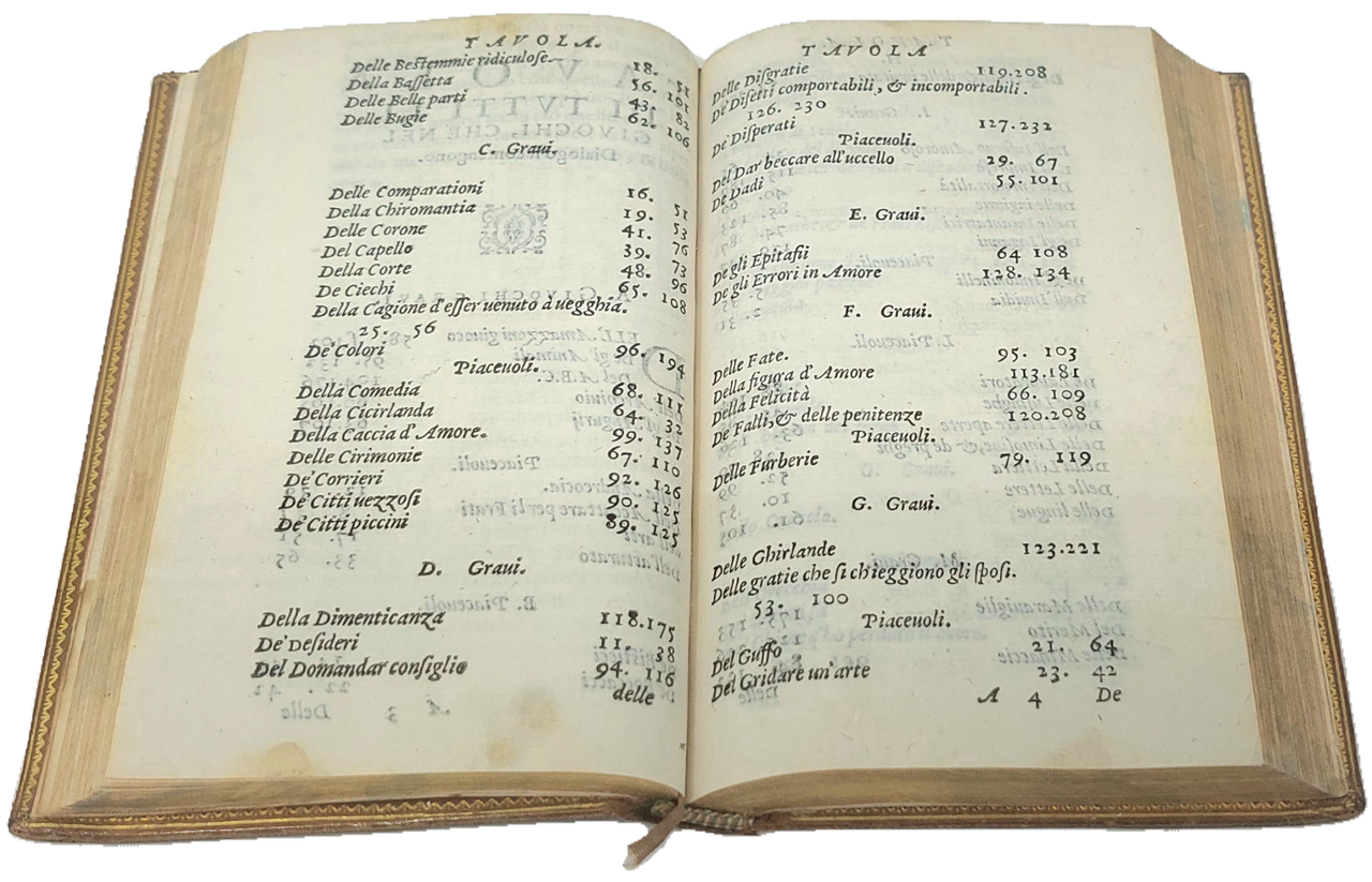 >2 opere in 1 volume in-8 (148x90 mm), bella legatura del XVIII secolo in marocchino nocciola, con bordura in oro stilizzata con aquile ed elementi vegetali, bel dorso “à la grotesque” con titolo in oro su tassello, dentelles e tagli dorati. Comprende: 1) Lettere amorose di madonna Celia... ff. 70, impresa dello stampatore, iniziali istoriate. Rarissima edizione (censita in sole tre Biblioteche italiane) di questa raccolta di lettere d'amore scritte da Celia, nobildonna romana, al suo amante. L'opera venne pubblicata per la prima volta nel 1562 e rappresenta un raro esempio di letteratura femminile nel Rinascimento, anche se alcune bibliografie identificano in Girolamo Parabosco il possibile autore. "A mantenere il credito del Parabosco, dovette gioviare, oltro lo stile elegante, pomposo e fiorito, corrispondente al gusto dei tempi..." (Bongi). La presenza di un sonetto a firma di Celia Romana in una raccolta coeva (Tempio 1568, c. 31v) potrebbe invece corroborare l'esistenza della letterata donna romana (cfr. Cox); l'Autrice si copre sotto lo pseudonimo, non casuale, di "Celia", ossia scherzo. L'opera fu ristampata dieci volte fino al 1628.2) Dialogo de' giuochi... pp. 288. Impresa tipografica al frontespizio, dedicatoria a Isabella de' Medici Orsina Duchessa di Bracciano, dedica del tipografo ai lettori e indice alfabetico dei giochi descritti. L'opera venne edita la prima volta a Siena nel 1572 e più volte ristampata (cfr. Brunet). Nella presente dedica viene ripresa quella della editio priceps del Bonetti che avverte che l'opera venne scritta, "già più anni" e pubblicata senza la revisione dell'autore, perché questi datosi "tutto all'avvocazione e al foro e non stimando più quest'opera per sua, non ha potuto né voluto porvi più il pensiero, non che la mano". Il dialogo è quindi l'ultimo documento degli interessi giovanili del Bargagli: lo compose in segno di riconoscenza per l'Accademia degli Intronati nell'allontanarsi, come egli stesso dice nel proemio dell'opera, "da, suoi piacevoli studi". Si tratta di un dialogo platonico tra alcuni giovani Intronati riuniti intorno a Marcantonio Piccolomini, detto il Sodo. L'opera si apre con la fondamentale distinzione dei giochi: di spirito, d'ingegno, di scherzo o di piacevolezza, prosegue poi con il catalogo e la minuta descrizione di oltre 130 giochi, intesi come giochi di società. La seconda parte tenta di delineare un ideale di perfetto accademico; si sofferma sull'invenzione delle imprese; analizza infine il novellare come genere d'intrattenimento. Ottimo esemplare seppur con macchia d'umido al margine inferiore bianco dei primi 4 fogli, con nitide note marginali di correzione del testo (benché le correzioni siano pertinenti e spesso di concetto, più che di forma, nell'edizione di Griffio, 1592 non risultano adottate, ma non è stato possibile confrontarle con le numerose altre edizioni). 1) Adams, P-506. Cox, Women's Writing in Italy 1400-1650, 2008, p. 317. 2) Melzi, I, 169; Adams, B-199. Brunet, II,666: "Ouvrage singulier". Gamba,1237: "L'Autore si copre sotto il nome del "Materiale Intronato" Choix de Olschki,II, 2567: "ouvrage curieux, sur les jeux et divertissements de la noblesse de Sienne." Pitré, 2183.