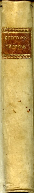 In-4°, pp. (52), 330, (22) di indice, legatura coeva p. pergamena rigida. Tagli marmorizzati rossi. Vignetta incisa al titolo col frullone e il motto della Crusca. Velature con parziali reintegrazioni manoscritte antiche di lettere di testo andate perse alle pp. 7-8. Testatine e capilettera incisi figurati. La vita dell'autore è scritta da Mario Fiori. Buon esemplare. Prima edizione, pubblicata 450 anni dopo la morte di Guittone d'Arezzo. 'In questo libro si leggono le piu antiche lettere che siensi scritte nel nostro idioma. Ne contiene XL, fra le quali sono alcune da altri Autori a fra Guittone indirizzate. Deesi la pregevolissima edizione a monsignor Bottari, che la illustrò con prefazione, con erudite note grammaticali e con indice' (Gamba). Gamba, 574 (indica come antiporta quella che, di fatto, è la carta di occhietto). Graesse, II, 185. Manca a Parenti, Prime edizioni italiane.