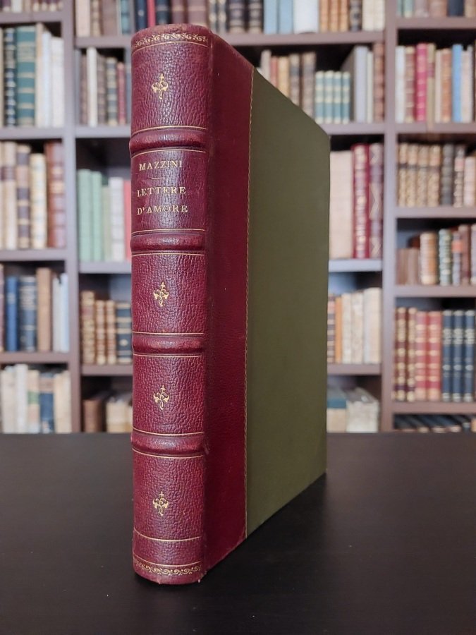 In-8° (cm. 22), legatura coeva in mezzo marocchino,<span style="font-size: 13.333333px;"> dorso a nervi</span> con titolo, filetti e fregi floreali ai comparti in oro, risguardi marmorizzati; conservata la brossura originale con titolo in rosso e nero entro una cornice architettonica con ricchi decori floreali in silografia e puttino al piatto posteriore, tutto realizzato da Giuseppe Bodrato, pittore, acquerellista, scultore e incisore genovese; pp. XV [1b] 297 [3b] su carta a mano della cartiera Miliani di Fabriano, in ottimo stato (lievissime e sporadiche fioriture). Testo inquadrato da filetti rossi. Il volume raccoglie principalmente le lettere mazziniane a Giuditta Sidoli; da p. 227 si trova una scelta di altre lettere. Esemplare n. 88 firmato dall'editore. In ottimo stato. (NE2)
