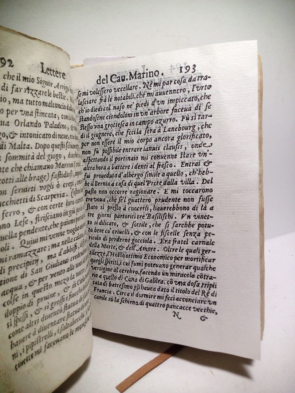 [Edición original].- Con Licenza de' Superiori, e Privilegio. In Venetia: [en colofón] Appresso Francesco Baba, M. DC. XXVII. [1627].- 7 h., 350 p., [1 h.]: Retrato [facsímil] del Cavalier Marino tras las primeras siete hojas, pequeño grabado xilográfico en la portada y letras capitales de los últimos versos; 8º menor (15,2 x 15,5 cm); Encuadernación actual finamente ejecutada en Pleno Pergamino, lomo rotulado a mano y cintas de cuero para cierre del libro.* El retrato de Marino es facsímil, al igual que la hoja correspondiente a las páginas 193-194. Ambos facsímiles están excelentemente realizados sobre papel de la época. Tiene alguna notita marginal manuscrita y una tenue señal de humedad en el ángulo superior externo de las últimas hojas. Por lo demás el libro se encuentra en muy buen estado. Este gran poeta Napolitano del siglo XVII, fue fundador del estilo llamado Marinismo, después secentismo. Su obra se caracterizaba por un uso extravagante y excesivo de conceptos, llegó a imponerse en la poesía italiana del siglo XVII. Su estilo de poesía, basada en la exageración del artificio manierista, está colmada de antítesis y de un sin fin de matices de palabras, pródiga en descripciones y de una sensual musicalidad. Gozó de muchísimo éxito en su época, pudiéndose comparar al que tuvo Petrarca antes que él. LITERATURA Y ESTUDIOS LITERARIOS EXTRANJEROS DE LOS SIGLOS XVI-XXI