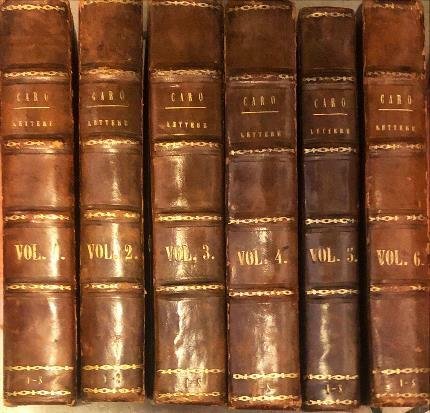 Sei Voll. In 8° (cm 21 x 12,8), pp. [LXIX] + 371 + 386 + 462 + [XIX] + 437 + 365 + 391. Leg. mezza pelle marrone, piatti cart. marmorizzati nero e arancione. Tit. oro al dorso con sei nervature. Segni di consunzione ai margini e alle cuffie. Il sesto volume presenta abrasioni ai piatti. Tagli celesti. Lievi fioriture diffuse. Ex-libris all’occhietto. Quarto, Quinto e Sesto Volume: Delle lettere del Commendatore Annibal Caro scritte a nome del Cardinale Alessandro Farnese. Buone condizioni.