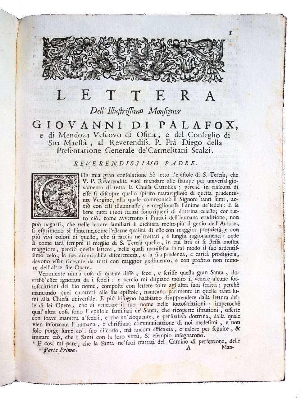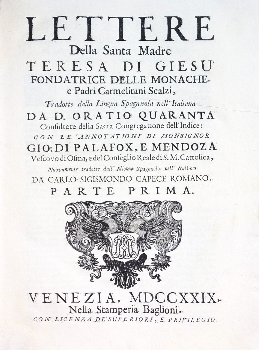 Lettere della santa madre Teresa di Giesù fondatrice delle monache, e padri Carmelitani Scalzi, tradotte dalla lingua spagnuola nell'italiana da d. Oratio Quaranta . con le annotazioni di monsignor Gio. di Palafox, e Mendoza . nuovamente tradotte dall'idioma spagnuolo nell'italiano da Carlo Sigismondo Capece romano. Parte prima [- seconda]
