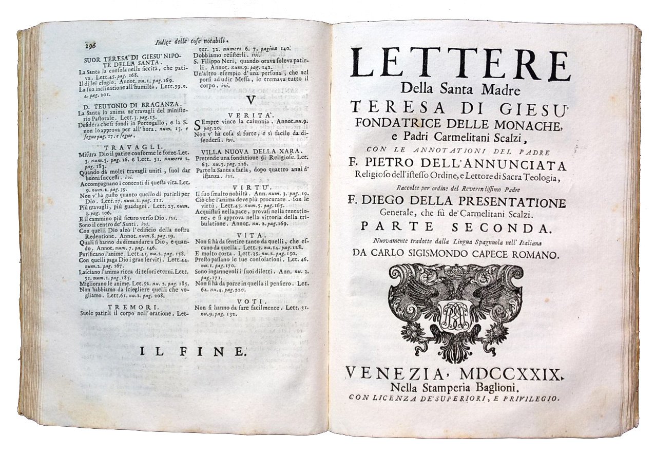 in-4° (228x166 mm), leg. coeva in piena pergamena, con cinque nervi e titolo manoscritto al dorso; 2 parti legate in un volume; pp. [8], 296; [8], 200. Frontespizi in bianco e nero, con marca xilografica (aquila bicipite coronata con scudo sul petto e monogramma). Iniziali e fregi xil. Bella edizione del Baglioni di questa raccolta delle lettere di madre Teresa di Gesù (Avila, 28 marzo 1515 - Alba de Tormes, 15 ottobre 1582), religiosa e mistica spagnola, una delle figure pié importanti della Controriforma cattolica grazie alla sua attività di scrittrice e di riformatrice degli ordini religiosi; fu la fondatrice delle monache e dei frati Carmelitani Scalzi. Venerata come santa dalla chiesa cattolica, é una dei 33 Dottori della Chiesa.Rif.: IT\ICCU\CFIE\013922. OCLC, 972894947. Cond.: Segni d'uso alla legatura (macchie, abrasioni e alcuni spacchi lungo i bordi dei piatti). Carte pulite, con rare fioriture. Opera nel complesso molto buona. -- Beautiful Baglionbi edition of this collection of the letters of Mother Teresa of Jesus (from Avila). VG copy.