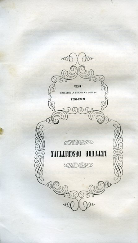 In-8°, pp. 34, brossura marmorizzata coeva. Ottimo stato. Comprende le seguenti prose: La casa di Giovanni Boccaccio in Certaldo; Possagno patria del Canova; La prigione del Tasso, e la casa dell'Ariosto in Ferrara; Matilde Polfranceschi; Il fiume Aizok; Si descrve la Niobe della galleria di Firenze; Il pallone aerostatico; I lavori delle pietre dure nell'Accademia delle belle arti di Firenze; La villa di Soffiano nel contado di Firenze; Scrive d'aver viaggiato con due americani; Al canonico Astimagno sulle sue poesie; Il viaggio da Firenze a Genova; Il ponte d'Augusto, e il ponte di Civitacastellana.