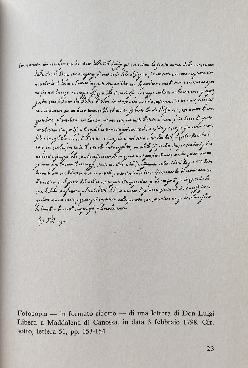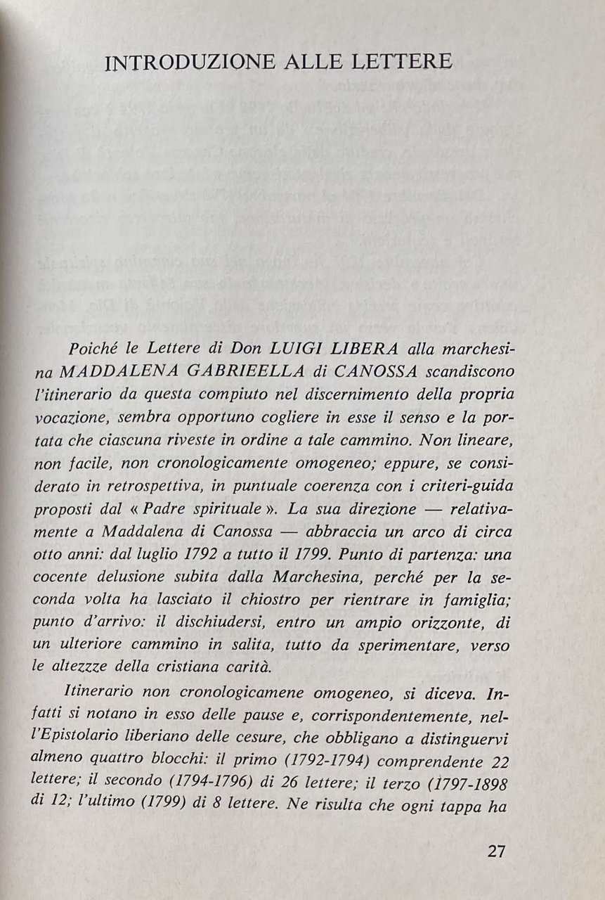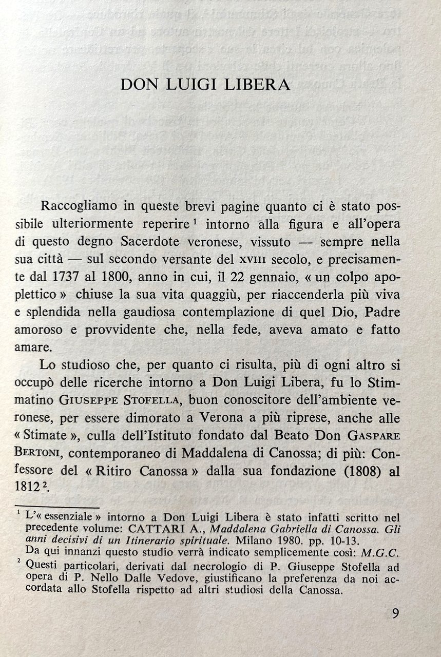 Il presente Epistolario, perciò, vorrebbe rispondere a due esigenze: fornire una panoramica più completa della guida spirituale donata da Don Libera alla giovane Canossa; mostrare, benché modestamente e in ambito necessariamente ristretto, le meravigliose possibilità di educazione alla vita cristiana offerte al ministero sacerdotale. Nel dialogo saggio e discreto che gli è proprio, quante persone anche oggi, e non solamente in ambito giovanile, potrebbero trovare risposta alle proprie ansie ed aspirazioni, purché esso avvenga sotto il segno e nella fedeltà allo Spirito del Signore Gesù Cristo. Per Maddalena di Canossa questa possibilità si è rivelata una felice realtà: possa essa manifestarsi tuttora operante e ricca di promesse per tanti giovani alla ricerca della propria identità in seno alla Chiesa di Dio; suscitatrice di nuove speranze ed energie in tutti coloro che, pellegrini verso la Patria, vanno riscoprendo il senso cristiano della vita, della comunità e della comunione.