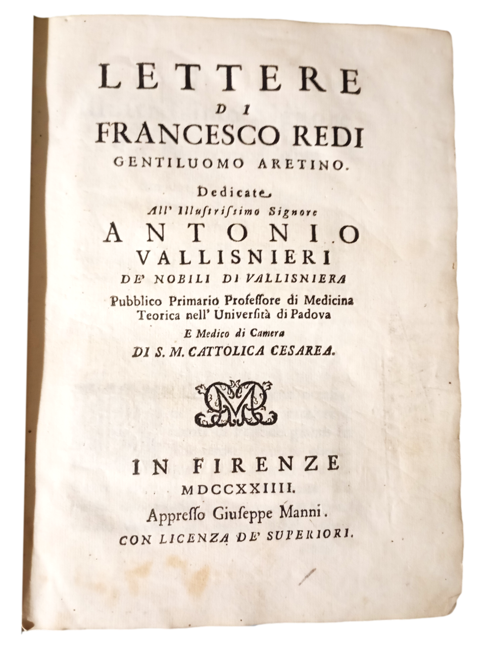 Lettere di Francesco Redi gentiluomo aretino dedicate all'Illustrissimo Signore Antonio Vallisnieri de' Nobili di Vallisniera, Pubblico Primario Professore di Medicina Teorica nell'Università di Padova e Medico di Camera di S. M. Cattolica Cesarea.