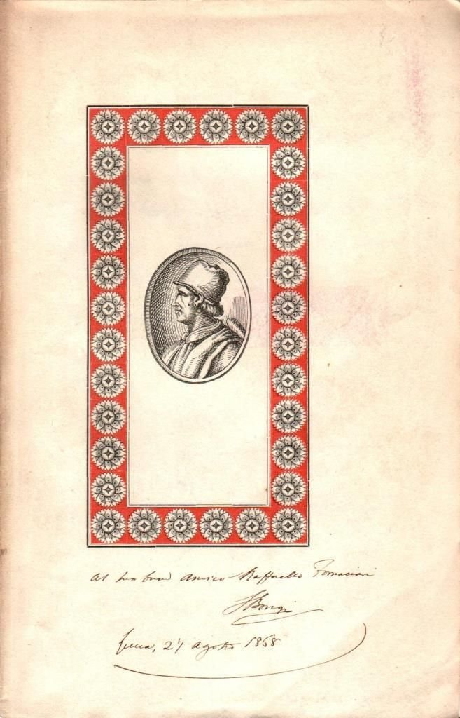 Al piatto anteriore presente dedica del curatore Salvatore Bongi, datata 27 agosto 1868.