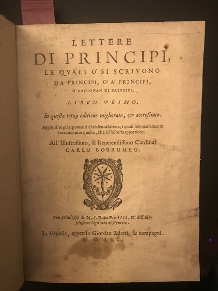 Lettere di Principi, le quali o' si scrivono da Principi o' a' Principi, o' ragionan du Principi. Libro Primo. In questa terza editione migliorato & accresciuto. All'Illustrissimo, & Reverendissimo Cardinal Carlo Borromeo.
